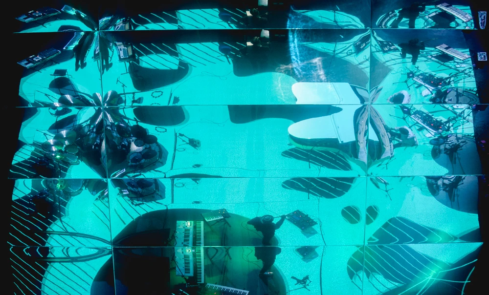 АКАДЕМИЧЕСКИЙ ФОРМАТ ИСПОЛНЕНИЯ ПРИВЕЛ НАС К ИДЕЕ МЯГКОГО ОФОРМЛЕНИЯ СЦЕНИЧЕСКОГО ПРОСТРАНСТВА. ОНА ВОПЛОТИЛАСЬ В ОГРОМНОЙ ЗЕРКАЛЬНОЙ КОНСТРУКЦИИ, СЛОВНО ЗАВИСШЕЙ НАД ПЛОСКОСТЬЮ СЦЕНЫ. В ЭТОМ БОЛЬШОМ ЗЕРКАЛЕ ОТРАЖАЛИСЬ АРТИСТЫ И ГРАФИКА С НАПОЛЬНЫХ ДИОДНЫХ ЭКРАНОВ. В ИТОГЕ ЗРИТЕЛЬ ВИДЕЛ СРАЗУ НЕСКОЛЬКО ПЛАНОВ: ОДИН — САМУ ГРУППУ НА СЦЕНЕ АНФАС, ДРУГОЙ — ТЕХ ЖЕ МУЗЫКАНТОВ НА СВЕТЯЩЕМСЯ ДИОДНОМ ПОЛУ, ОТРЕФЛЕКСИРОВАННЫХ В НАКЛОННОМ ЗЕРКАЛЕ.