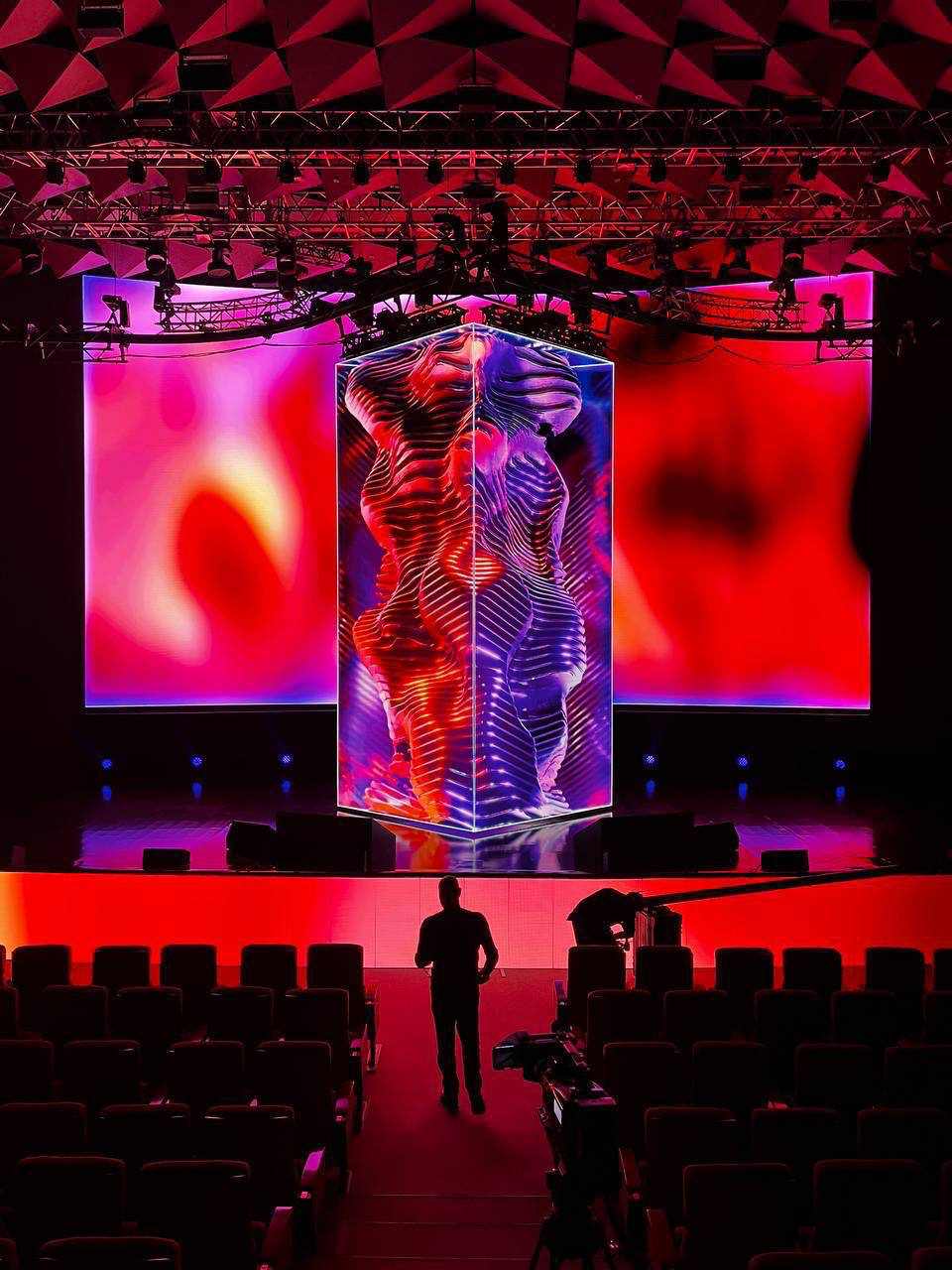 Визуальный язык проекта был выстроен на стыке искусства и технологии. Мы превратили абстрактные цифровые платформы в ощущаемый мир импульсов, движения и смысла — мир, где человеческий и машинный интеллект работают в синергии. Это не просто сценография, а среда, где рождается вдохновение и ускоряется мышление. Где технологии обретают форму, а искусство становится их интерфейсом.